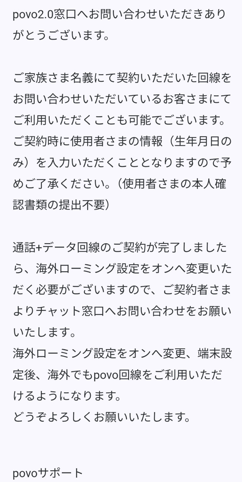 povoのFAQに家族名義利用のケースが掲載されていたため、サポートに問い合わせました。