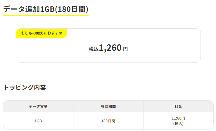 データ追加1GB(180日間)税込み1260円のこのトッピングです。