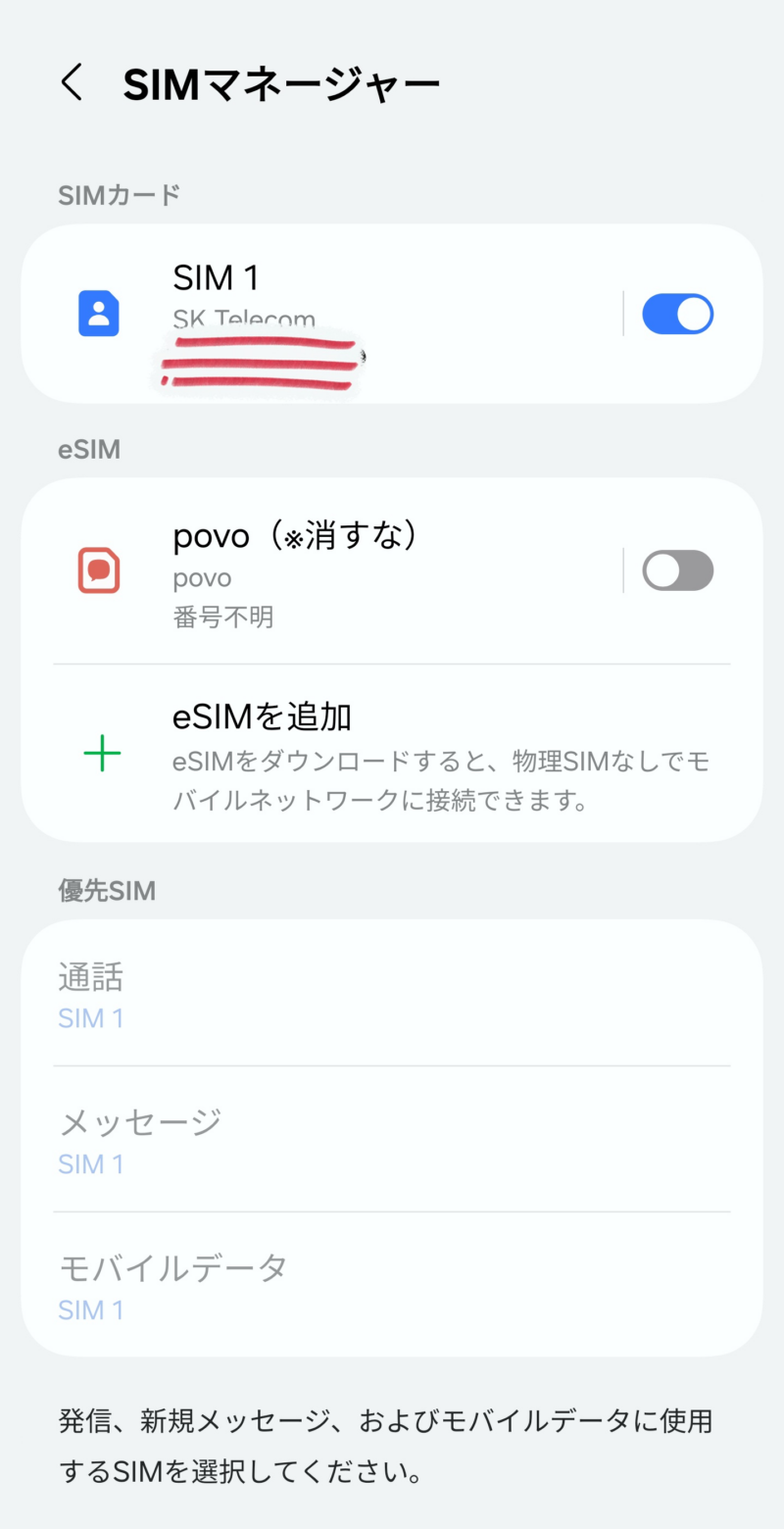eSIMは今現在は韓国にいるので、「povo(※消すな)」と設定しているもののみです。