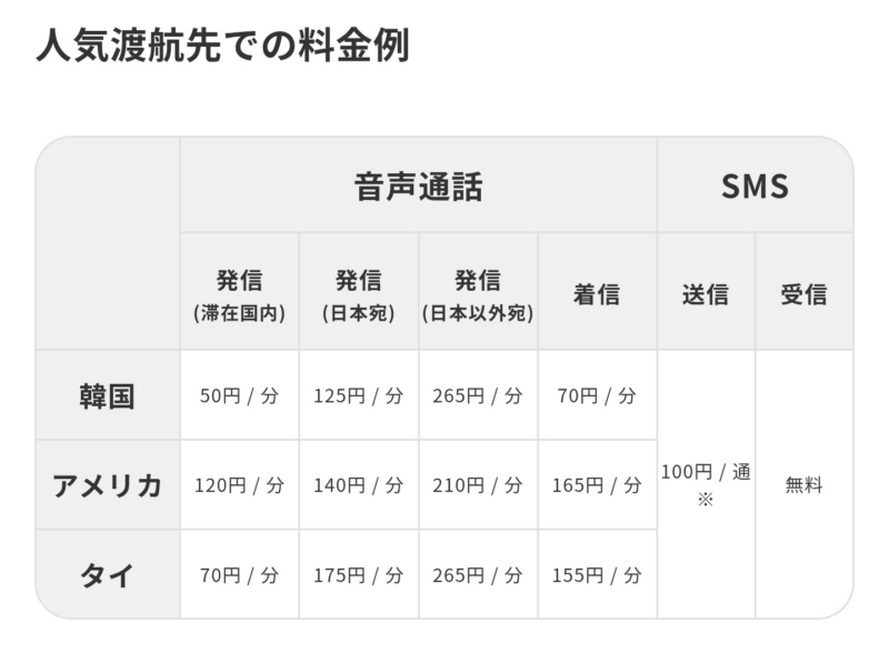 ただし、通話料金は別途発生します。(国によって料金が違います)